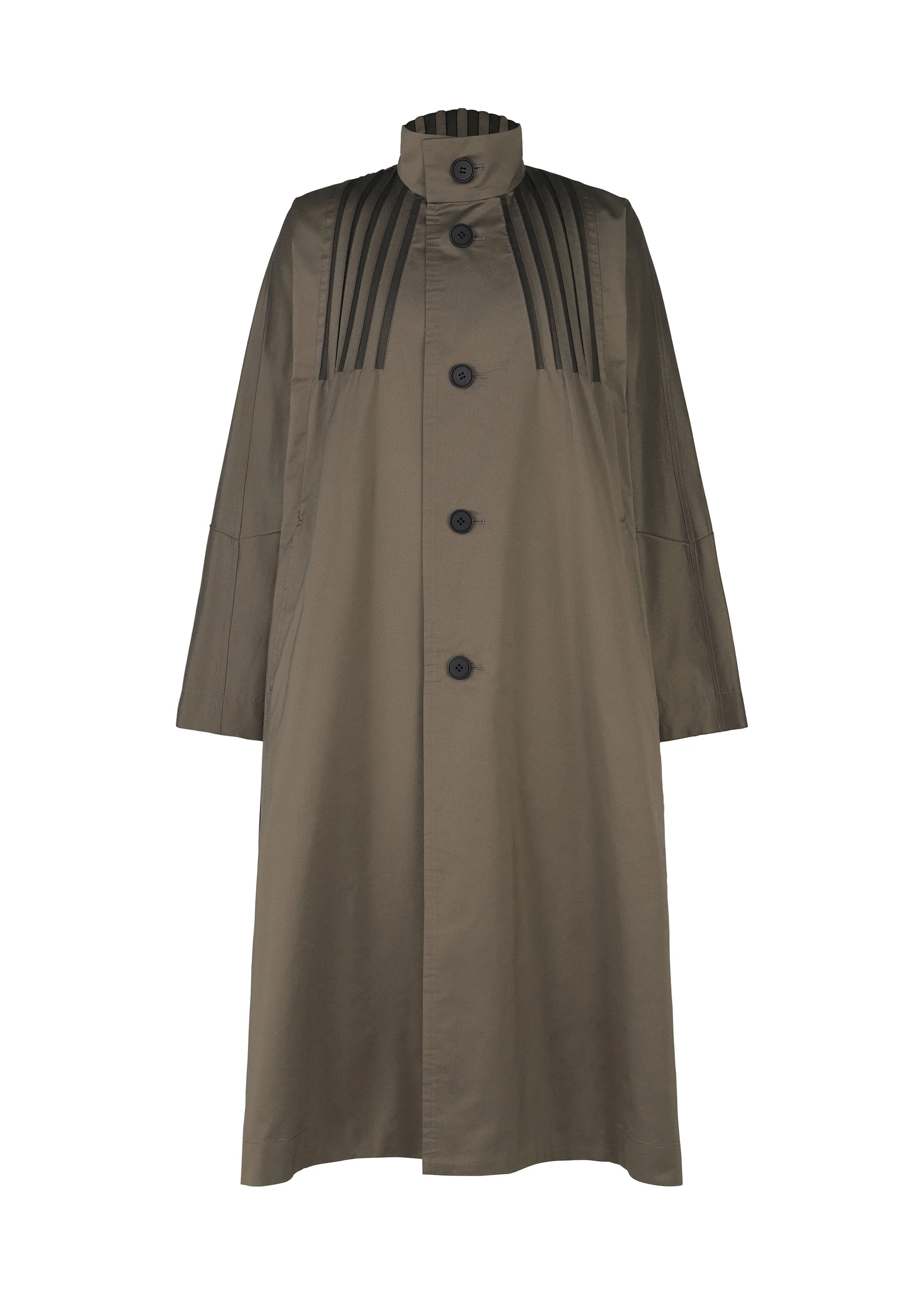 一部植物由来原料のポリエステルと綿ポリエステル糸を混織した、軽量で日常に最適なストレッチ性のある素材を使用したコート。Steam Stretch(※)による蛇腹形状をウェスト脇部分に配置し、見た目の美しさと機能性を兼ね備えています。
