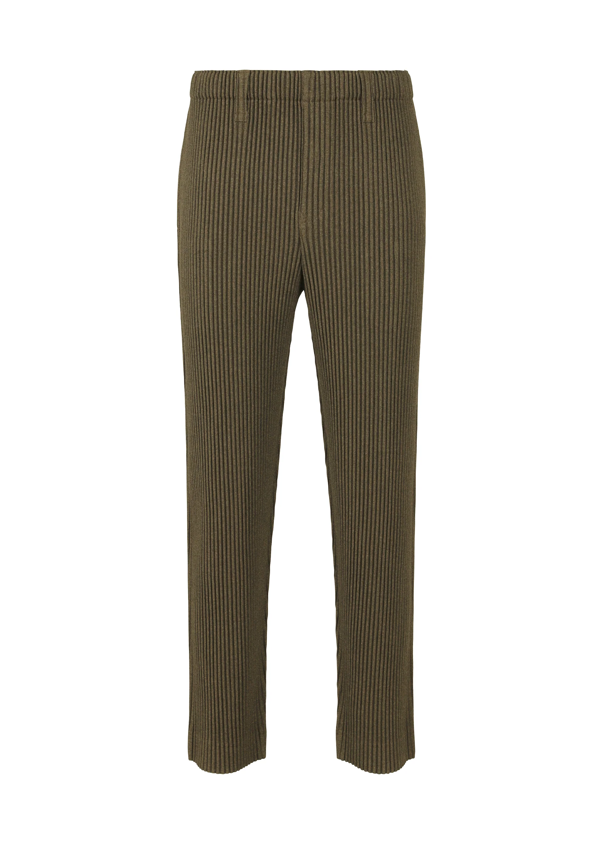 ポリエステルでありながら、柔らかくしなやかな風合いが特徴のストレートパンツ。両サイドにポケット、ウエストにベルトループがあります。前開きボタン仕様です。
