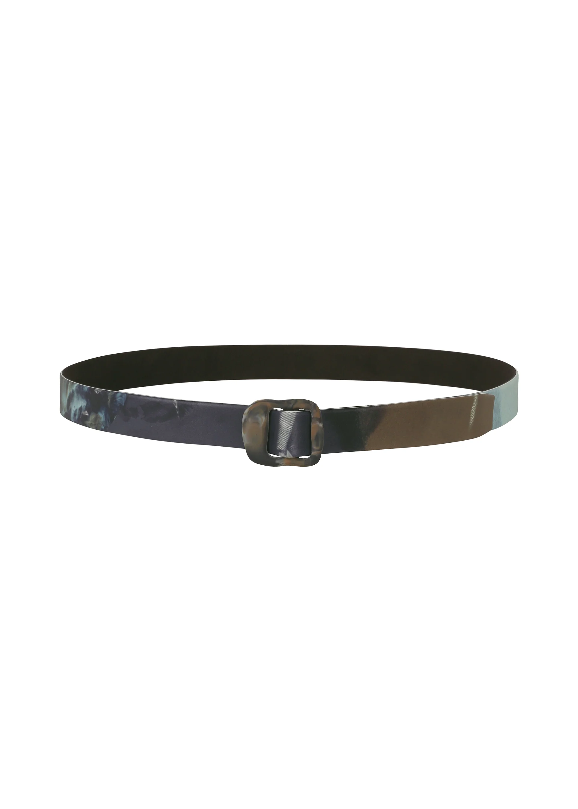 石をイメージした有機的な造形のバックルが特徴のベルト。印象的な柄は、ポリエステル樹脂を型に流し込んで生まれるマーブルの技法によって作成しています。表面はプリント柄、裏面は無地のスエード素材となっており、リバーシブルで着用することができます。