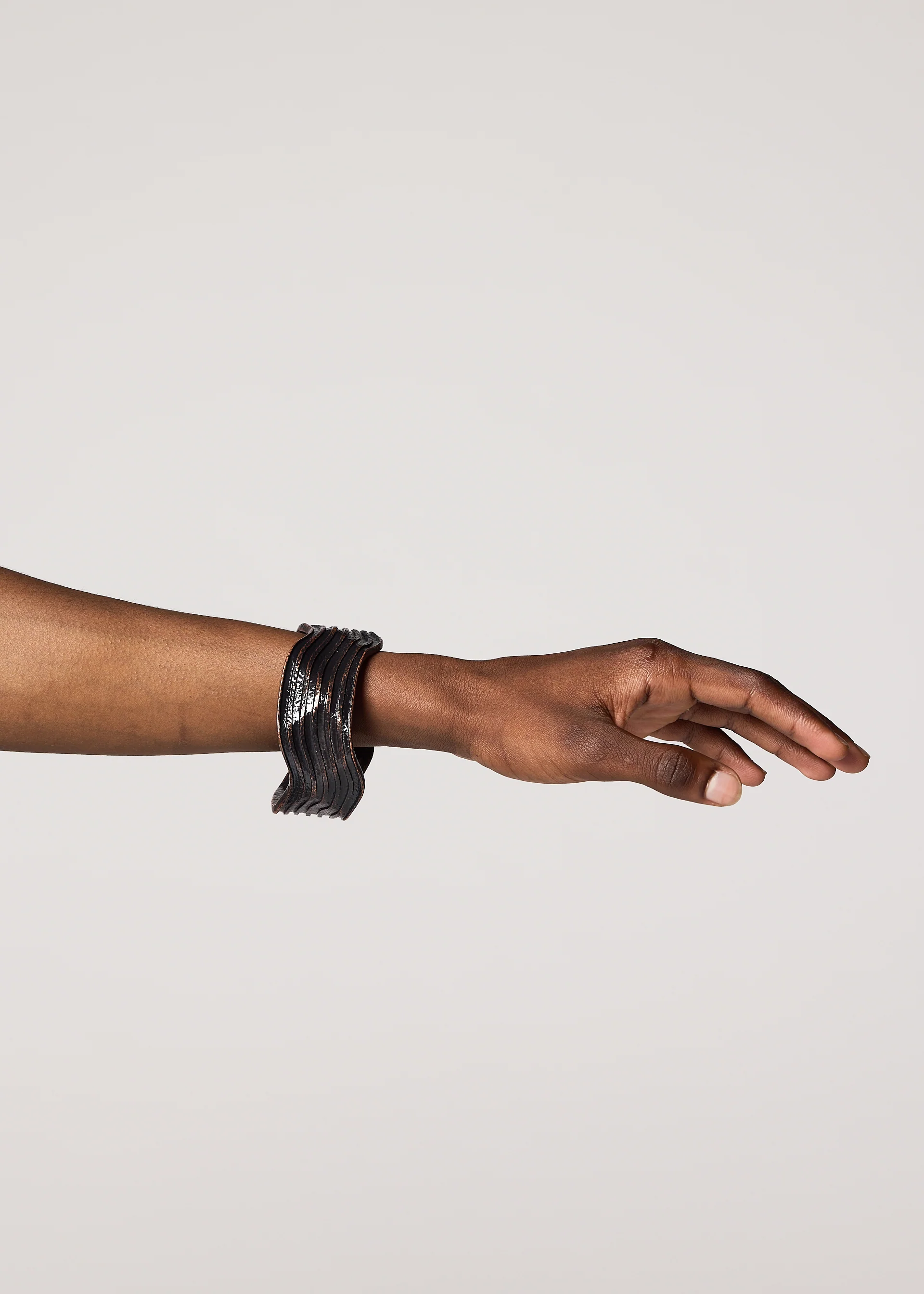 陶芸家・加守田章二氏の作品群『曲線彫文』から着想を得たバングル。有機的でありながら緻密に設計された波状の彫文と造形を再現しました。定着させた表面の仕上げをあえて剥がすことで、焼き物特有の風合いと質感を際立たせた独自の加工を施しています。スタッキングすることで、壺のアウトラインをより鮮明に感じ取ることができます。