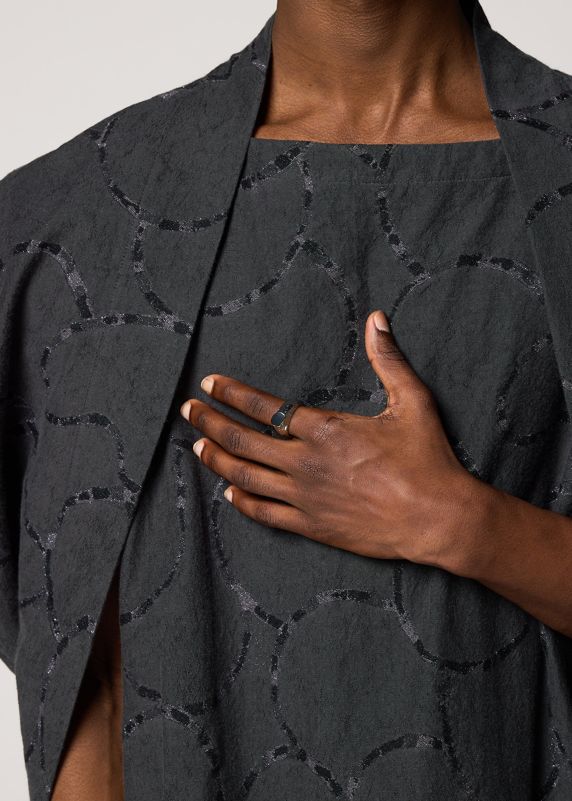 17号サイズのリング。スカーフリングとしても使用できます。定着させた表面の仕上げをあえて削り取ることで、焼き物特有の風合いと質感を際立たせた独自の加工を施しています。控えめながらも存在感のある仕上がりで、装いに奥行きを与えてくれるアイテムです。
