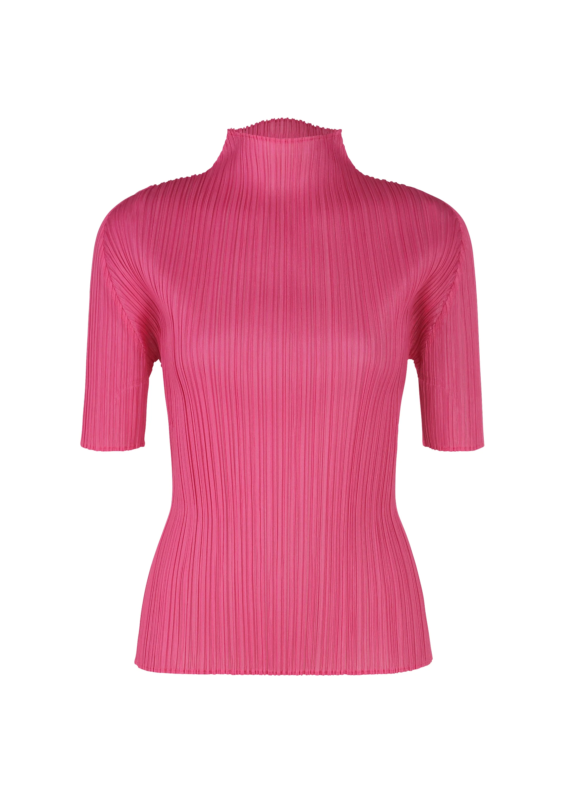 透け感が美しい新素材のハイネック半袖トップ。同シリーズのアイテムを重ねたり、プリントシリーズと重ねたりと、色と形の組み合わせを楽しめます。